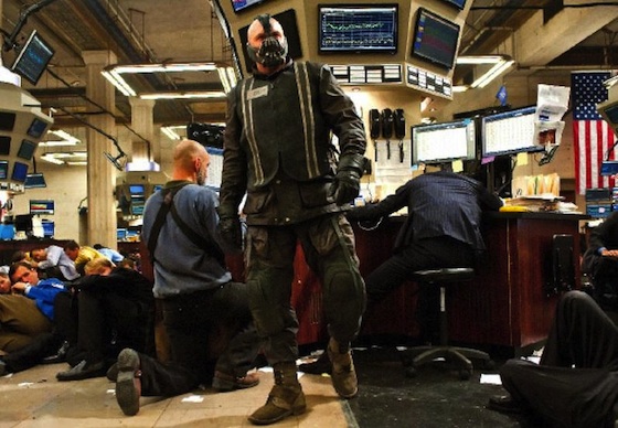 Wayne, who has expended most of his fortune on developing a fusion reactor that he mothballed when he learnt it could be turned into a nuclear weapon by Pavel, is left further shorn of his previous privileges as his company is bankrupted by Bane during a raid on the Gotham stock exchange. Soon, his belongings are being repossessed, and Alfred, afraid this time Bruce is biting off more than he can chew, abandons his boss mid-fight. Wayne gets Selina to guide him to Bane’s hideout, but this proves exactly what Bane wanted: he traps Wayne, beats him to a pulp, and breaks his spine before exiling him to the same don’t-say-it’s-Afghani prison where Bane himself once resided. Bane is then free to terrorise Gotham, setting off bombs all over the city, bringing down bridges, clogging up tunnels, and managing to trap most of the police underground, cutting Gotham off from the outside world, and taking it over as a supposedly revolutionary city-state.