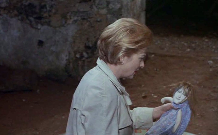 Gwen makes a disturbing discovery, of a male doll Ronnie had bought for Linda as a suggestive partner for the female figurine she perpetually sports. Gwen finds this hidden in the crook of a tree with its head removed and riddled with pins, and it stirs her suspicions that she’s dealing with something she has encountered before. Ronnie’s mother (Carmel McSharry) flees town with her son when he recovers, and her husband (John Collin) visits Gwen one night in the schoolhouse stinking drunk, distraught at the collapse of his life. When Gwen lets slip that she suspects Granny Rigg might have cursed Ronnie in some way, he goes to visit her, but turns up drowned in a nearby lake. Before she can report her story at the inquest, Gwen, staying overnight at the Bax’s house, is stricken down with a vision of the Juju mask and she awakens in a nursing home, having completely lost her memory of the past three years.