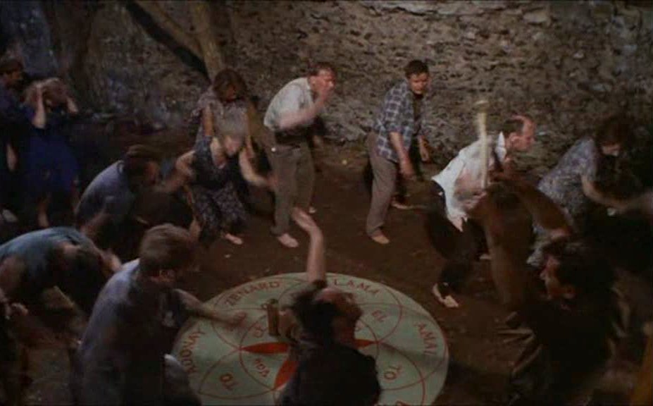 The Witches partners squarely with the same year’s Plague of the Zombies, though not played in a period setting, by invoking similar motifs: the secret link between colonialist horrors and malevolence infecting the coloniser’s homeland, an evil manipulated by the mansion on the hill, and virtually surreal visions of atavistic rites within the supposedly staid and settled English order of things. True weirdness finally, explictly manifests when Gwen ventures into the cave where the coven meets, discovering a cabalistic dial on the ground upon which a strange doll-like object seems to dance spontaneously—it’s actually got Granny Rigg’s familiar-like cat sewed up inside, and has a photo of Linda’s face pinned to it.
