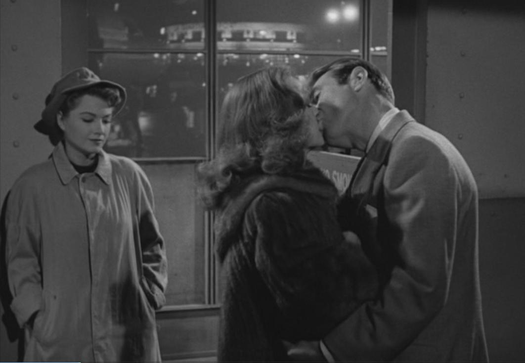 Margo, of course, has played the star so long that she can display artistic temperament in her sleep. The problem with that particular script for a woman, however, is that it has a shelf life. Even extraordinary talent will only go so far once a woman has passed her peak of physical beauty. When she sees Bill off to California, Margo warns Bill not to “get stuck on some glamor puss.” He chides her for being childish, to which she responds helplessly, “I don’t want to be childish. I’d settle for just a few years.” His increased irritation only pushes her further, “Am I going to lose you, Bill? Am I?” And like the proper denouement to a truthful scene played for high theatricality, Bill takes her in his arms, tells her “As of this moment, you’re six years old,” and starts to kiss her. Their scene is interrupted by Eve handing him his airline ticket, a suggestive statement of theme that is itself theatrical.