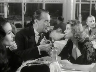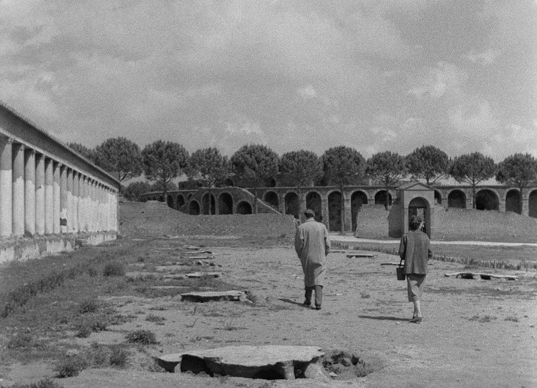 If I could accept this film as wholly personal, I would feel less acutely its very troubling subtext—that a marriage can exist only if the wife is broken. Alex becomes attracted to Marie (Maria Mauban), a young woman hobbled by a broken ankle, during his time on Capri. He holds her arm as she moves awkwardly with the assistance of a cane, and begins to declare his feelings when she says she has reconciled with her husband, who is to join her in Italy soon. He backs off, and briefly flirts with the idea of hiring a prostitute to assuage his disappointment. Instead, he returns to Katherine with instructions that he wishes to sleep late, setting up a situation for another argument the next day, as they tour Pompeii, when he will ask her for a divorce. As they drive back from the ruin, shaken by the sight of a couple lying side by side, hollow figures of ash preserved with plaster pumped into the cavities, they get stuck in a throng of people celebrating a holy day. Katherine exits the car and is swept up by the crowd. She yells to Alex for help, and he runs to her side. She declares she doesn’t want to lose him, and he says he loves her. Shaken by the thought of divorce and frightened by being torn into a mindlessly menacing crowd, Katherine capitulates. Her call to be rescued means victory for male domination, and their embrace, to me, tastes of the ashes that entombed the couple in Pompeii.