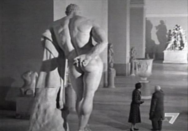 Regardless of the intimacy of the story, Rossellini’s approach to filming Journey in Italy is to play it against the vast weight of Italian history. It is uncomfortable to watch Rossellini put Bergman in precarious positions like a mere speck in time. For example, when she visits the sulphur banks, her guide shows how exposing any of the vents to heat, even that of a cigarette, will cause the entire field to fill with plumes of gas. When Katherine tries it with the guide’s cigarette, they are enveloped, as though she had been swallowed up in hell. In another scene at an art museum, Katherine is unnerved by the painted eyes of the Roman sculptures, and Rossellini deliberately frames her being menaced by one of them or overshadowed by gargantuan men of marble. Her leopard coat made her look like a predator at the start of the film, but as the events of the film gradually unnerve her, her protective clothing gets thinner and thinner. Is she becoming less guarded with Alex, or is Rossellini just defanging her?