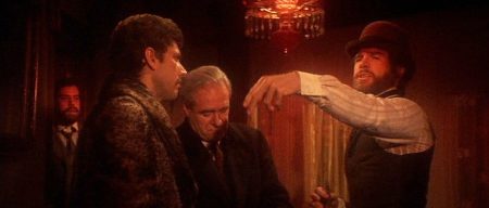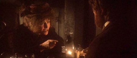McCabe’s attempt to regain the upper hand when two representatives of Harrison Shaughnessy come to make him an offer sets him onto a path towards a lethal confrontation, anticipated in the joke he tells the two emissaries, Sears (Michael Murphy) and Hollander (Antony Holland), about a frog eaten by an eagle who then pleads not to be defecated out at a great height. McCabe’s pride as a successful entrepreneur, a big fish in a small pond, is truly worth more than money to him, and even when Miller has told him the danger he’s courting, he still can’t bring himself to accept an offer. He assumes business is a process of negotiation, but it’s actually a monologue of power and need. A food chain of hype is evinced throughout: at first McCabe easily outwits Sheehan’s deal-making and has other men repeating his words in awe, where later McCabe will be the one who can’t make deals and finishes up parroting a fancy Lawyer’s (William Devane) folderol about taking over big monopolies and trusts. McCabe’s fate is sealed by his own posturing, but also by pure chance: Holland is peeved he’s been sent out on such an errand and can’t be bothered hanging around for more negotiating. There’s a quality of ruthless wit in Christie’s performance, in the way her Miller’s hard glaze of disappointment and dread after listening to McCabe’s first explanation of his encounter with the emissaries gives way to an expression of indulgent adoration when he returns, a shift enabled more by a big dose of opium smoke than his hopeful tidings.
