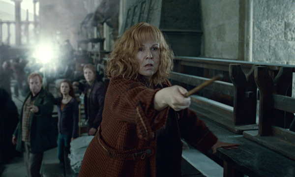 Yates has successfully maintained continuity in the series with a vivid tradition of British fantasy. Big finishes to huge movie series are notoriously difficult to pull off. Even the points where it stops for breath and stock-taking become part of a genuinely tense anticipation. Peter Jackson’s Lord of the Rings: The Return of the King (2003) is, in spite of its longuers, pretty much the gold standard of that sort of thing, though I tended to think back more to Return of the Jedi (1983), the underrated series closer of the Star Wars saga, as one of the better examples that, in spite of the Ewoks and lazy plotting, managed to sustain and contrast three different levels and types of conflict. It’s in this regard that Yates stumbles a bit in moving between focal points in his colossal final battles, which lack the sorts of varied, rapidly intercut vignettes that make for great battle scenes. I had expected Yates to expand upon the snippets Rowling provided, but he rather disappointingly doesn’t. Molly Weasley’s (Julie Walters) death duel with Bellatrix, perhaps the most relishable and unexpected scene in the novel, makes the cut, but it’s poorly set-up and weirdly jagged, as if Yates sensed everyone would be ticked off if he didn’t include it. This appears to be evidence that the constant pressure to keep everything moving makes the editing occasionally too tight. But still, these are fairly minor quibbles.
