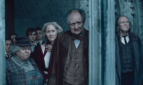 If there’s a loss with this incident-packed grand finale, it’s of those dryly funny little set-pieces that have come to truly mark Yates’ contributions to the series, offering nothing quite as weirdly funny as the spider funeral in The Half-Blood Prince (2009) and the Nick Cave dance in The Deathly Hallows: Part One, and few of the more intimate character moments that had featured since Alfonso Cuaron’s The Prisoner of Azkaban (2003). There is, however, a last-minute breath of the wispy sensuality that has often pervaded the series, as Harry attempts to appease the ghost of Helena Ravenclaw (Kelly Macdonald, along with Hinds, the only major new blood), a vision of angry, melancholic beauty guarding the permeable gates of life, love, and death. This mood floats up again in a flashback revealing the tragic history of Snape’s love for Harry’s mother, when he delighted her with levitating flowers and bawled in pain over her dead body. Such is a timely reminder of the moral and emotional cost of Voldemort’s predations that echo on through generations and inspire depths of hatred and determination of quite supernatural intensity. There’s an action set-piece in which Harry, Ron, and Hermione battle Draco Malfoy (Felton) and his goons in the Room of Requirement, concluding in a firestorm that is spectacular, but gilds the lily a bit. The same can be said, though in a different sense, for a scene in which Harry, before offering himself up Christ-like for Voldemort, chats with the shades of his parents (Adrian Rawlins and Geraldine Somerville), Lupin (David Thewlis), and Sirius (Gary Oldman): the point of the scene has been endlessly reiterated throughout the series, and seems more an excuse just to squeeze those actors in again.