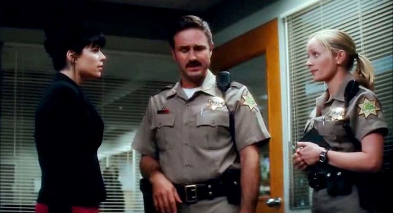 However, Scream 4 backs off from this almost immediately; Craven and Williamson out themselves as fundamentally old-school guys, for whom the brute immediacy of blood and guts subverts and offsets such trickery, not the other way around. With killers more intent on doing a reboot than a sequel, the stage is again Woodsboro, the bland small town where Scream unfolded. Stab 7, we soon find, is actually being watched by two more trim young missies, Jenny and Marnie (Aimee Teegarden and Brittany Robertson), and they really are attacked and brutally killed by a new Ghostface. This coincides with Sidney Prescott’s (Neve Campbell) return to Woodsboro on a book-signing tour, having turned her earlier battles with evil into Oprah-ready confessional-therapeutic literature. Her appearance puts her back in the orbit of old partners in crime-fighting Dewey Riley (David Arquette), now Woodsboro’s sheriff, and his wife Gale (Courtney Cox). Edging into middle age is gnawing at them all of, as Gale has no new grist for her pulp-smith mill, Dewey is being courted by his worshipful deputy Judy Hicks (Marley Shelton), and in spite of her official triumph and platitudes of healing, Sidney still carries an aura of doom and regret with her everywhere she goes.