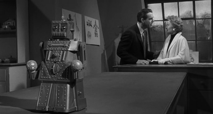 Stanwyck and MacMurray’s final collaboration, There’s Always Tomorrow, is a film in which women take the strongest hand against the hapless male lead, toy manufacturer Clifford Groves. Groves has been left by the side of the road, as his wife of 20 years, played by Joan Bennett, dedicates herself completely to her home and children. It seems to Cliff that he was just a means to this end, and when a former employee—childless, divorced, fashion designer Norma Vale—comes back to town and looks him up, he’s ripe for a change.