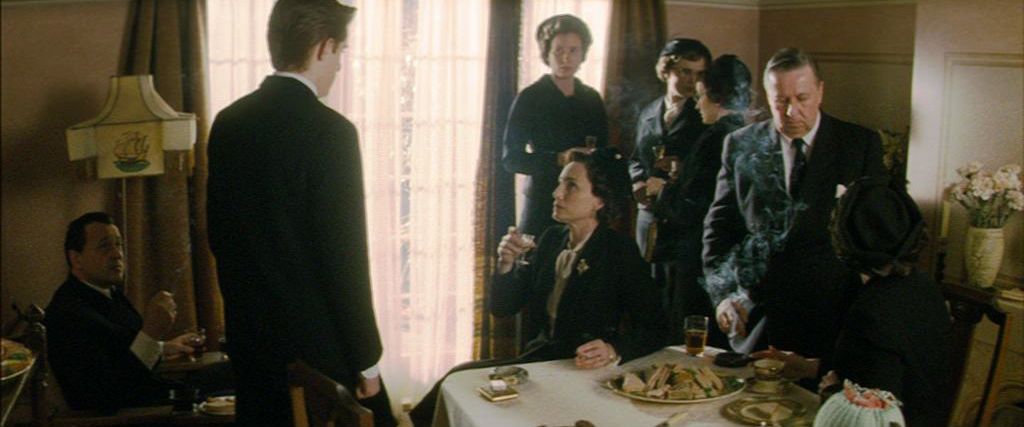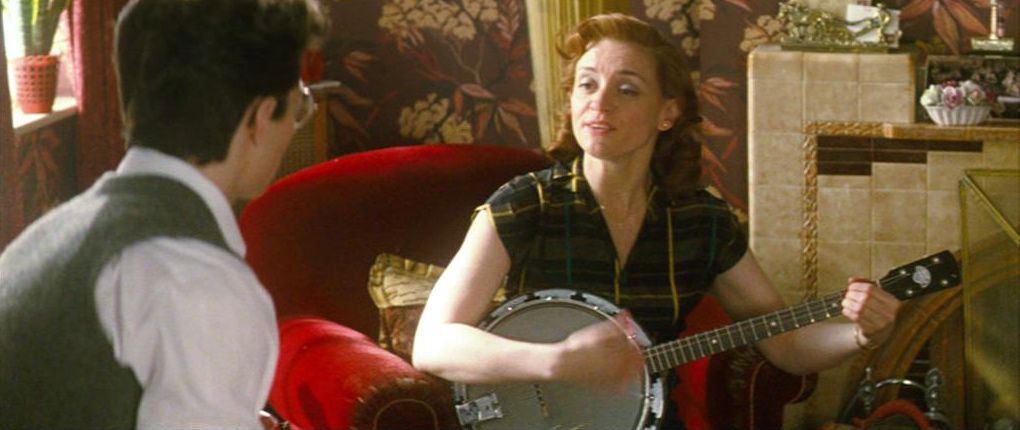 Nowhere Boy recounts a defining triangle that’s well known to anyone who’s ever read about Lennon’s life: his relationship with his stern bourgeois aunt and guardian Mimi (Kristin Scott-Thomas) and his mostly absent, free-spirited but fragile mother Julia (Anne-Marie Duff). Julia left John to live with Mimi amidst the wreckage of her marriage, another part-victim of the Second World War’s chaotic impact on settled lives, and also of Julia’s own mental instability; these reasons are at least in part motivations that John (Aaron Johnson) has to discover in a variety of emotional detective story, because they’re deeply hidden under layers of protective propriety. The sudden death of John’s father figure, his Uncle George (David Threlfall), proves a catalyst for John as he’s passing through his middle teens; his behaviour becomes wilder and angrier, and he glimpses Julia for the first time in years, hovering at George’s funeral. When his cousin Stan (James Johnson) pries John away from Mimi for a day trip to Blackpool, he tells John he knows where Julia lives. When John calls on her, she grasps onto him with famished eagerness. After he’s suspended from school for touting pornography, John starts hanging out during the day at Julia’s place, and she introduces him to playing the banjo. That cosy arrangement ends when Mimi finds out what’s going on and confronts the pair; John momentarily spurns Mimi, but is forced to return to her when Julia’s husband Bobby (David Morrissey) worries that having John around might cause another of her breakdowns.