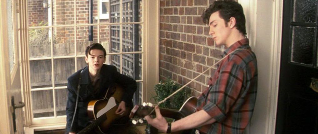 In the meantime, John doodles in notebooks, practises funny voices, cuts class, seduces girls into elementary sex in the park—there’s one of those “fish and finger pies”—and bubbles with latent creativity. He stoically dismisses his headmaster’s abuse by calling himself a genius. As rock ‘n’ roll soon becomes John’s obsession, he finds it’s also Julia’s love, and she gleefully explains the etymology of the phrase. His channelling of his unruly, rebellious, creative energy into that despised art form is partly informed by the alternatives Julia offers, and her own wayward, undisciplined joie-de-vivre and porous boundaries. Discomfortingly, a spark of something suggesting attraction between him and Julia percolates unconsciously as the sensual older woman encounters the good-looking young bloke she barely knows. John, having found a constructive form of rebellion, announces to his mates when they’re gathered for a smoke in the school toilets that he’s going to form a skiffle band. When they prove surprisingly enjoyable at a public performance in a local park, with John’s charismatic, enthusiastic performing drawing real interest, they soon attract Paul McCartney (Thomas Sangster) and an alarmingly young George Harrison (Sam Bell). They have prodigious instrumental skills Lennon smartly adopts forthwith, but he’s also jealous of them when he notices they can turn attention, including Julia’s, away from him. Meanwhile, John’s increasingly aggressive, brittle behaviour drives Mimi to ineffective punishments and widens the gap between them.