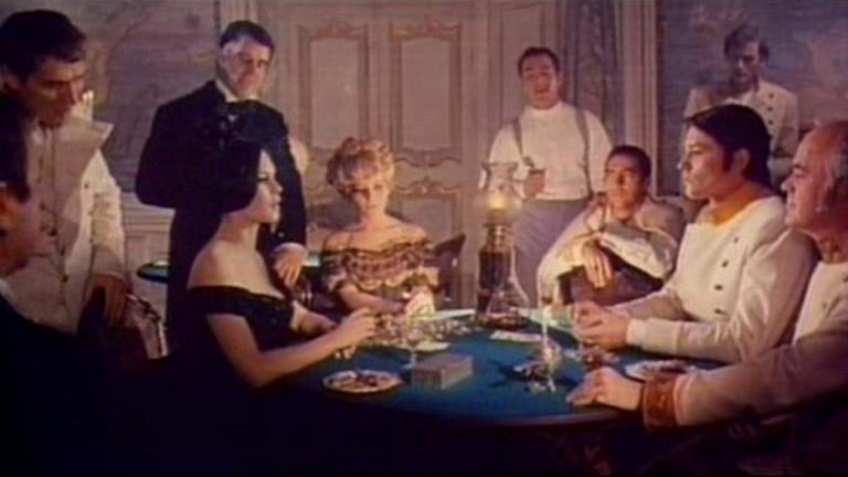 Malle’s episode, although less showy than either Vadim’s or Fellini’s, is actually close to perfect. Alain Delon offers an excellent performance as the titular William Wilson, an icy egotist and sadist with a pristinely pretty face tormented by a double who heads off his own worst impulses. In confessing a murder to a priest, Wilson recounts his life story, from attending a military boarding school as a child where his overlordship of his fellow students and his vicious regime was first challenged by the arrival of another student named William Wilson who stood up to him and freed a young schoolmate the sadistic Wilson had dangling over a pit of rats. Years later, as a medical student, Wilson had become even worse, this time leading a cabal of fellow students in attempting to dissect, whilst still alive, a young woman (Katia Christin) snatched off the street: again the mysterious other Wilson intervened. When serving as a soldier and having matured into an infamously violent rake, Wilson engaged in a battle of wills with a female gambler named Giuseppina (Brigitte Bardot), whom he delighted in cheating out of a victory and then getting his kicks by flogging her. But the double again intervened to reveal how he cheated. Finally losing control, Wilson murdered his alter ego after losing a duel with him.