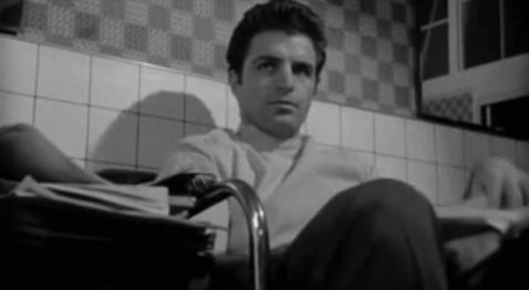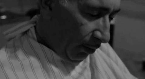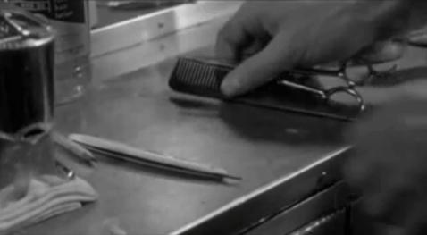 Moon hires hitmen for a mobster named Mr. Vick. He decides to let Claude stew for a couple of weeks after their interview. Famed cinematographer Lucien Ballard shoots Claude in a monotonous routine of dressing, exercising in his room, taking in food trays and tipping the server one of the dimes he has lined up on the table, and waiting for the phone to ring—which it eventually does. Claude is given his first contract, efficiently shown with quick shots of three people tied up in a back room, a sleepy man in a barber’s chair, and Claude emerging from behind a newspaper wearing a white barber’s coat, placing a protective cape around the man’s neck, and grabbing a straight razor from the real barber’s shelf of equipment. Moon pays Claude $500, and at his home, Claude records the sum in a notebook that lists the money he has versus the money he needs to buy the house.