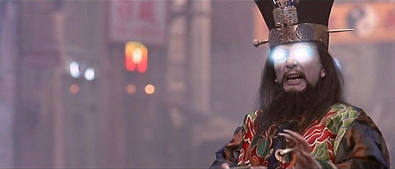 Jack recompenses Wang by taking him to pick up said fiancée, Miao Yin (Suzee Pai), from the airport, where Jack eyes Gracie Law (Kim Cattrall), a civil rights lawyer. She’s trying to shepherd immigrant Tara (Min Luong) safely past a waiting coterie of thugs from a Chinatown street gang on the lookout for girls to kidnap and force into prostitution. When the goons snatch Tara, Jack confronts them, only to be quickly toppled; the thugs take Miao Yin instead. Jack and Wang chase them to Chinatown, where they’re caught in the middle of a battle between the evil Wing Kong triad, and the good-guy Chang Sing gang, who are having the funeral procession for a leader and are ambushed by their enemies. The Chang Sing’s retaliation proves effective until the intervention of the Three Storms—Thunder (Carter Wong), Lightning (James Pax), and Rain (Peter Kwong)—bizarre beings that seem to have supernatural powers. The Storms slaughter the Chang Sings where they stand. When Jack tries to escape this melee by driving his truck through it, he seems to run down a tall, regally dressed man whom Wang thinks might be David Lo Pan (James Hong), the legendary head of the Wing Kong. Lo Pan seems unhurt by Jack’s truck, and rays of blinding light shoot from his eyes and mouth.