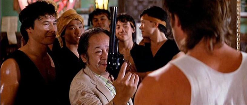 Another thing that marked Carpenter out as a filmmaker, but which made him seem increasingly out of place in modern Hollywood, is his care in evoking a sense of milieu and situating his heroes as a part of an ordinary world. Often, they’re blue collar dudes and ladies, included by accident in greater machinations. Big Trouble commences with an opening that gives a fine sense of Burton as both a bit of a blowhard, ranting on the radio before cramming a giant hoagie in his mouth, but also as a cool guy. After delivering a load of produce to a market in San Francisco, he sits down to gamble with the mostly Asian porters and buyers, including his old friend Wang Chi, a self-made restaurateur. Carpenter doesn’t need a word of dialogue to show us who Burton, Wang, and the rest are: normal people doing real things and relaxing in a normal way, the sort of things nobody does in modern action blockbusters except in the most laboriously signposted fashions. The only remarkable moment is a challenge between Wang and Jack. Wang, who’s just lost all the money he’d saved up for a lavish welcome back from China for his fiancée, bets Jack double or nothing he can split a beer bottle in half with a meat cleaver. He fails, and Jack catches the bottle, which shoots across the table at him, proving he has brilliant reflexes. That’s a classic piece of establishing a hero’s gifts, but it’s a promise the film deliberately, hilariously delays fulfilling.