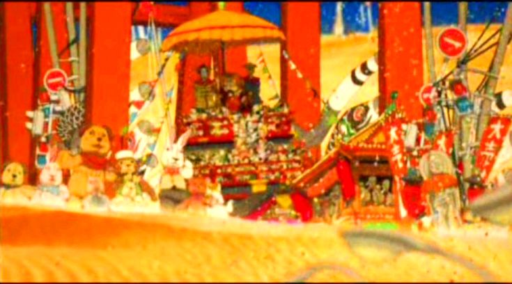 Paprika herself embodies Chiba’s frustrated youth and playful instincts, which enables, rather than contradicts, her great professional ability. Paprika can be read as a film that is also about the creative impulse, with Chiba/Paprika evolving constantly in her sense of herself as a nexus of influences she takes in and then gives out. Similarly, Togawa comprehends his life as one of real dedication sprung from fictional creation. Tokita’s attempt to redeem himself by entering Himuro’s dream to draw out the villains gets him swept up pretty quickly, but later, Tokita, in his dreamscape reconfigured into one of his own collectible robots, destroys the gigantic Ichibana doll that is Inui’s favourite avatar. By the film’s madcap final 20 minutes, all of Tokyo has become engaged with the mass dream to the point where nobody’s sure what’s real and what isn’t; to Togawa and Shima’s bewilderment, Chiba and Paprika argue with each other over what course of action to take. Finally Paprika, yin to Inui’s yang, reconstructs herself into a colossus like him, growing both in size and through physical ages with the battle cry, “There’s always an opposite. Light and darkness, life and death, man and woman. And to spice it all up, you add Paprika!” She literally consumes Inui in defeating him. It’s both a send-up of, and a tribute to, the traditional monster-bashing finales of so much anime and keigu eiga movies. Finally, although he doesn’t get the girl, Togawa goes out and buys himself something just as vital to a well-balanced life: a movie ticket.