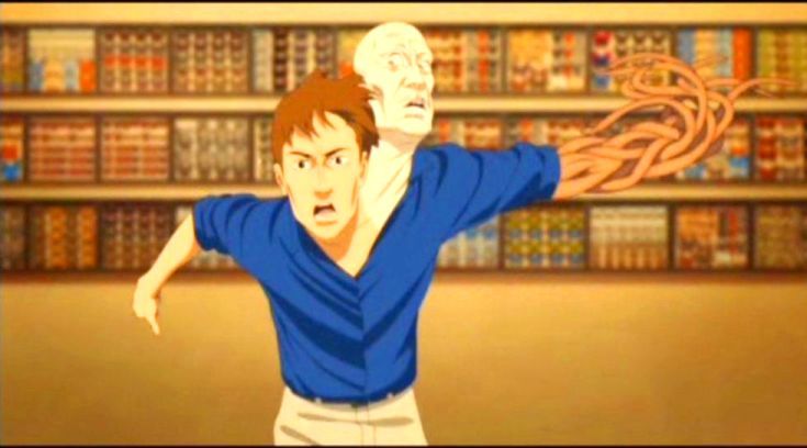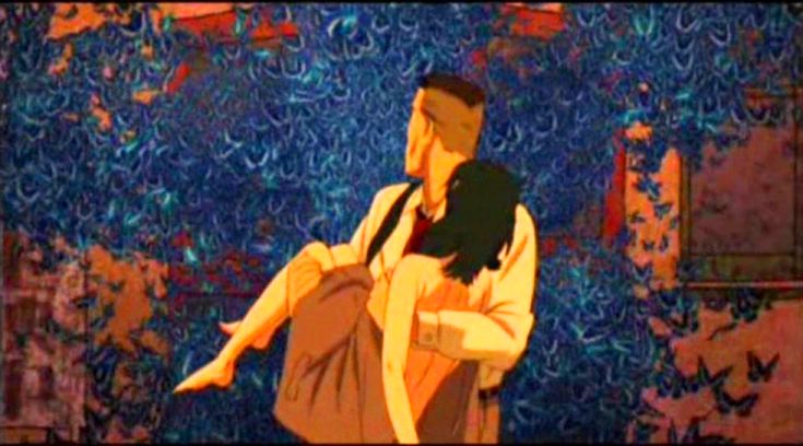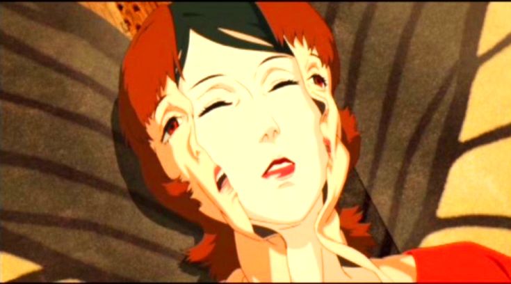 Those villains are Dr. Seijiro Inui (Toru Emori/Michael Forest), the wheelchair-bound director of the Foundation, who believes that the dream-invading techniques are an abomination he’s using to teach a painful lesson to their proponents, and Osanai. But it’s clear that both men’s intentions have become blurred with a hunger for power for its own sake, as Inui becomes a colossus unlimited by his physical disability. Osanai, terminally jealous and desirous of Chiba, has become Inui’s lover in order to share in using the DC-Mini and possess Paprika. Kon respects the protean, often highly sexualised, if not specifically sexual, nature of dreaming, and the film is richly, playfully, and sometimes acutely aware of the eroticism that pulses through the material whilst going nowhere near the seamier precincts of animation. Some of this is on the level of a naughty pun, like Paprika giving Shima a different kind of blow job: she sinks inside of him and then inflates him like a giant balloon, which then bursts, waking him up. Elsewhere it’s more evocative and pointed. Particularly, beautifully kinky and nasty is the scene in which Osanai, having captured Paprika, has transformed her into a huge butterfly he has pinned to a table, and, with relish, plunges his hand into her groin and slides his splayed fingers up under her skin, peeling the Paprika shell off Chiba, discovered inside.