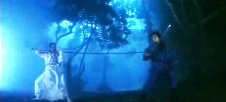 A lot of credit for the heft of the films is owed to its terrific pairing of Cheung and Lin, two of the best actors in Hong Kong cinema (though Cheung’s contribution to the second film is disappointingly brief), and especially Lin, who commands the films like an empress. They both considerably overshadow the younger actors in the sequel. There’s a touch of tribute to John Carpenter as the languorous, suggestive sequences of Lyre being ritually subsumed into the cult by Chen Yuanyuan echo the similar scenes of heroines in Big Trouble in Little China (1986), whilst the scene in which Kit dances before his wedding, blindfolded and playing a lyre given as a wedding present, has a quality similar to the rapturous little touches with which Zhang Yimou would decorate his wu xia films. After one fight scene, Wu cuts to observe the glittering drops of a slain man’s blood drip from the fronds of a silvery bush, a poetic flourish of a kind that dots both films, and it’s worth noting the intensity of the design element to the films, with the great costume design by Emi Wada and the set decoration, especially in the recurring contrast between the livid whiteness of Nichang and setting rendered either in red, the same as the red blood that spits out of so many bodies, or rich nocturnal blue. Wu, a long-time editor who also served in that capacity on the first episode, offers direction slightly more prosaic than Yu’s, and the initial Seven Samurai-like story set-up more familiar, failing to ruffle the settled rhythms and naïve humour of the genre as much.