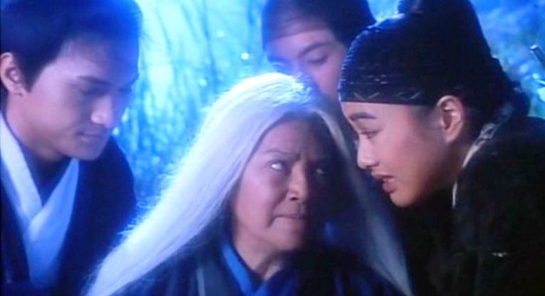 Wu’s half of the story presents several mirroring images of both the first film’s characters and their travails: where Zhuo and Nichang’s schism was something they tried to resolve in spite of their disparate worlds, Kit and Ling’s split is artificially imposed. The original’s core love triangle is reconfigured into a proliferation of grazing, inchoate relationships. Moon pines for Kit and is admired in turn by his determined but less good-looking fellow warrior Liu Hang (Richard Suen), who proves nonetheless a determined and able helpmate. Moon, with her mannish affectations—she’s seen constantly chewing on a cigarette—but thoroughly heterosexual ambitions stand in contrast to the cult Nichang runs with her collective of female assassins and their hideout’s air of lush sensuality. The clan warriors are placed under the command of the aged “Granny” of the Au Mei clan (Lily Chung), whose own mane of white hair sees her momentarily mistaken for the witch when she comes to take command. Moon fires off arrows at her, but she’s so good, she catches the arrows between her teeth. She’s also a disarmingly unaffected, calm, and wise person who prefers acting in defence and delegates to Kit when the time to attack arrives. Nichang in her transmogrified witch state can throw out her long white hair in tentacle-like coils that pierce the skin and drip poison. Moon is riddled with strands of the hair, and she’s left on death’s door, forbidden from attempting any kung fu; but she still leaps into the fray to save her friends with tragic results.