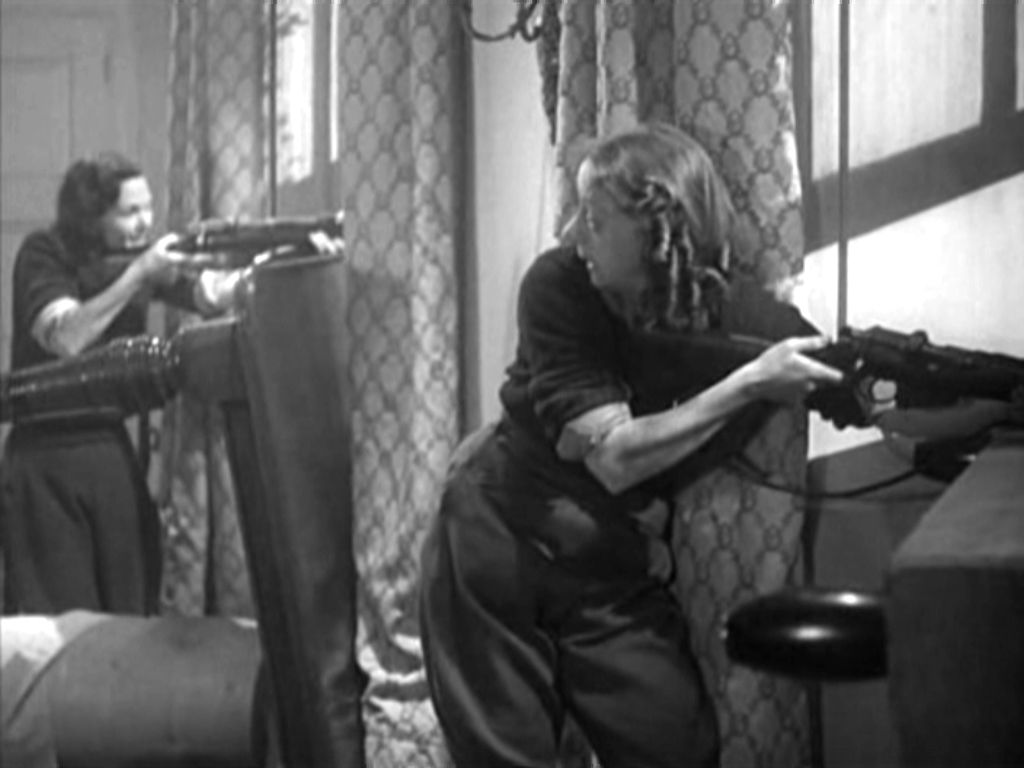 There’s humour to alleviate the ferocity, particularly in the reaction of the children, who seem less fazed by invasion than the adults, and the excruciatingly chirpy song “Cherry Ripe” is as amusingly employed here as in Night of the Demon (1957), sung by Mrs. Fraser’s sister as she obliviously trundles to and from the captive town. The excellent cast works in harmony throughout; it’s amusing to note that Lawton and Allan, playing partners here, had played mother and son in George Cukor’s David Copperfield (1935). Tension ratchets up to impressive degrees in the finale as the villagers are forced into action when, after an escape attempt, Jung announces the occupiers will shoot five children in the morning for punishment. That proves a real mistake, as a core guard of the Sturrys, Ivy, Peggy, Sims, and some others manage to overpower and outwit their guards and fortify the manor house. The Germans planned to use that house themselves, necessitating an assault on the manor as real British soldiers close in, precipitating a battle to the death. Nora’s killing of the traitor in their midst as he tries to open up the house to the Germans only temporarily keeps the enemy from literally invading the living room, and the heroes, anticipating perhaps their children in If… (1968), rain death upon their enemies to the last bullet. It’s an exhilarating and hair-raising end to a masterpiece of its kind, but it also proves that an inspiring film can be alarming as well.