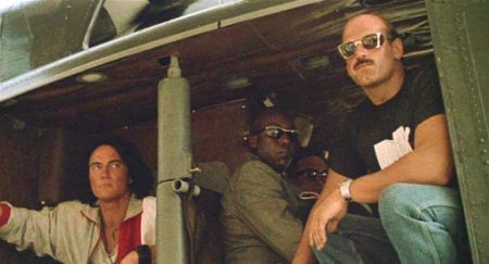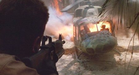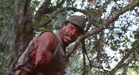 The popular perception of the war is played out: firepower-packing Yanks arrive, clean up the regular fighters easily, but find themselves up against a foe that can hide and plays a game they’re crucially ill-equipped to deal with psychologically as well as in method. Blain carries a version of the Gatling gun, a weapon that carries historical associations dating back to the Civil War, and also connects again to ‘Nam where was mounted on a plane dubbed Puff the Magic Dragon, used to devastating effect. And yet, like Hopper’s crew before them, who stand in for the lost patrols of ‘Nam, Dutch’s team finish wasting vast amounts of ammunition and muzzle velocity firing blind into the trees, hoping to hit something, fighting their own magic dragon. The team make an increasingly desperate trek to try and reach safe ground where Phillips’ helicopters can extract them, an extraction that has to wait because of the potential political furore that would explode if any US choppers were downed on the wrong side of the border. Hawkins’ death is followed quickly by Blain’s, felled by even bigger firepower, sparking the maddened wastage of ammo from his fellows. Trying to secure a position for the night, the team set traps that are deliberately triggered by the Predator with the ruse of driving a colossal wild pig through them, a beast Mac slays in the dark believing it’s his mortal foe, whilst the alien snatches away Blain’s body to use in its trophy-making habits.