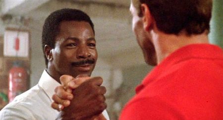 And yet Predator essentially pulls off the same joke of self-deconstruction as Last Action Hero would make a big show of doing, but in a far better-contoured and more efficient vein. The first act sets up the essentials of a classic war-adventure movie and a James Bond-influenced brand of action filmmaking, one in which the omnicompetent heroes are in such control of their derring-do they can toss smart-assed quips at their enemies in the midst of combat, taking the sting out of the post-Peckinpah realism in the violence as squibs erupt on the bodies of the decimated soldiers. Thus the first third of Predator is a wry parade of knowingly bombastic moments from its cast full of brawny protagonists, particularly Ventura, with his immortal announcement that “I ain’t got time to bleed.” The early scenes set up the dynamic as one of macho contest: Schaffer and Dillon meet an immediately engage in an arm-wrestling bout, biceps bulging under a patina of perspiration, cocaine buzz lighting up the stars’ eyes. The celebration of inflated masculine bodies kicked off by Sylvester Stallone, Schwarzenegger’s rival and Weathers’ costar in the Rocky films, had become essential to the action movie. Here the biggest source of cruel mirth is the sight of all these variously pumped bods displayed and fetishized only to then be outdone by a bigger, badder bod, who then sets about slicing these human fleshbags into constituent parts. Superman (1978), one of the progenitors of the ‘80s action movie style, had come at a point when the superhero’s body was pointedly resistant to all the forces of slaughter and decay celebrated in the grittier climes of ‘70s thrillers and horror movies. Predator found a more immediate way than the Alien films to infiltrate and subvert the action movie in this manner.