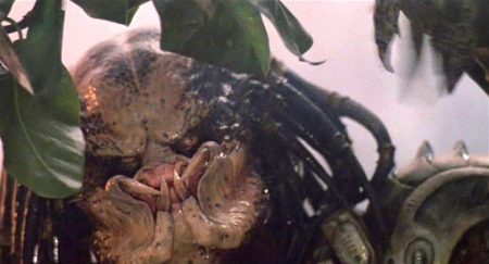 The Predator’s alienness is conceived and mediated in terms of devices of technological augmentation. His lysergic-hued point-of-view was achieved by radically employed new filmmaking tech whilst his habits of recording and looping back fragments of the human conversations he hears, render him an insidiously witty alien mixmaster. He is, at first, a stand-in for the audience as a fetishist enjoying the sounds and textures of the humans in all their homosocial habits as well as fascinated by their strange physiognomy, a strangeness conveyed to the audience through the transforming prism of his infrared sight. He also stands in for the filmmakers, trying to understand individuals as collectives of information, little catchphrases and earworms, accents and modes of expression, the things that make them distinctive but also knit them into a unit, a species. By the end the Predator has learnt enough human expressivity to laugh with mocking pleasure at the expectation even in death he can defeat his enemy. The Predator itself was subject to changes in look and concept during the shooting, shifting from a faintly biomechanical creation emphasising agility over bulk (played initially by Jean-Claude Van Damme), but soon revised into a hulking humanoid with crocodilian skin, spiky tendrils on its head that resembles a Rastafarian hairdo, and a crablike face sporting mandibles. McTiernan could get away with this shift because of his smart appropriation of Jaws’ policy of slowly revealing the monster, which depends on its sophisticated camouflaging, its ability to see prey who cannot see it in turn.