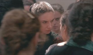 The stage is set for the first dance, in the Seville cigarette factory where the fictional Carmen works. A brilliant score that makes full use of the almost animalistic chanting of the flamenco singers works to bring this confrontational dance of insult and murder to its fever pitch, when Carmen picks a knife off a table and slashes at the throat of her coworker, played by Cristina. This and all the dances are the best I’ve ever seen committed to film, disproving Fred Astaire’s theory that dance must be shot full body. In the hands of a master director and cinematographer, tight angles, stark lighting, and circular motion communicate perfectly the enmity of the two women—but which women? The dancers or the characters they are playing?