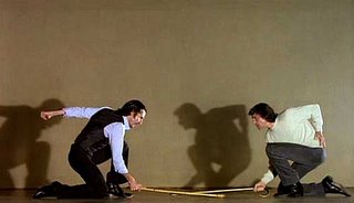 In the end, Antonio follows Carmen off the dance floor, which she has left in disgust as he, as Don José, has been challenge-dancing the bullfighter for whom the character of Carmen has rejected him. She repulses him, appearing to be speaking to him as Antonio, not Don José. She disappears into a doorway, and we see only Gades pleading and arguing into this hidden space. Gades removes a switchblade from his back pocket and stabs into the space. Carmen crumbles back into the frame. The camera pans back across the dance studio, where the rest of the cast is milling about, indifferent to what has happened in the corner of the room. Was this a “real” event or an invention of Gades the choreographer? In fact, it is neither. It is Saura completing his version of Carmen with a question mark.