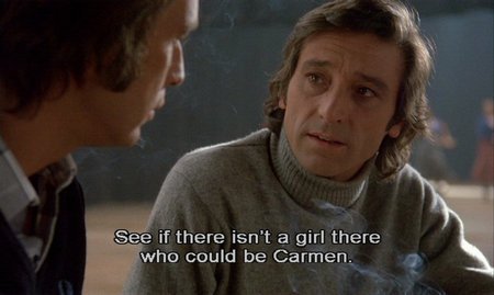 We move on to a huge dance studio, where dancers are lounging, talking, and trying out steps on each other. The camera pans across de Lucía and other musicians, who are jamming, and settles on Gades, who takes a reel of tape from a messenger, threads it into his tape recorder, and listens. “Pres des remparts de Seville,” Bizet’s waltz to be sung by Carmen, flutters on the air and then grows louder and louder as Saura zooms in on Gades’ face, watching him absorb the musical strains and try to visualize them in dance. This device of amplifying Bizet’s score will be used again to telegraph Gades’ state of mind and creative process.