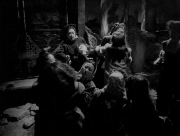 Mizoguchi claimed William Wyler as an influence on his cinema, and the deep-focus framing in his film does evoke that, although Mizoguchi’s own particular aesthetic developed more or less concurrently with Wyler’s. Either way, the deep-focus work is particularly revealing in scenes that invert the dramatic focus, like that in which Kuriyama eyes Fusako with appraising interest from the background whilst she stands in fumbling grief in the foreground, and later when Fusako’s son has convulsions, Mizoguchi keeps his camera outside the house, Fusako’s desperate reaction within distant and hopeless as the men in the foreground go racing off to fetch aid. This technique gave him a way of easing up on his usual exhausting long takes whilst retaining a fluidic, integrated mise-en-scène, as well as giving his dramatic style an ironic distance. The overall structure also bears similarity to John Ford’s adaptation of The Grapes of Wrath (1940), for Mizoguchi was also a Ford fan. The progress of the sisters towards finding temporary refuge and safety with a home for women run by conscientious men that offers shelter and food in exchange for labour echoes the way the Joads finally find the government farm in Ford’s film. Simultaneously, in its rigorous honesty, blasted imagery and vital humanism, Mizoguchi’s film certainly seems part of the post-War neorealist movement; indeed, his effortless fusion of the artistic and urgent sentiment is easily the equal of, and possibly superior to, what even the best of the neorealists were accomplishing at the time.