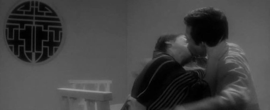 The declaration of Harumi’s status and profession immediately indicts her not as a meek or pathetic victim but as someone who will embrace with increasing volatility her role as a transgressor, a kind of guerrilla warrior against the entrapping paradigms of male dominance and military hierarchy. Her aggression is precisely envisioned in the very next shot: a knife hacks into frame, bright against the surrounding darkness. Harumi is wielding this weapon. The third shot is split, one side presenting a stylised tavern, represented as a table and chairs surrounded by epic darkness, and Harumi, wielding the knife, threatens her lover’s bride, telling her to go back to Japan, whilst the other side of the frame contains the wedding photo for the couple, emblem of the formal ties and powers that now weigh against Harumi. Suzuki cuts to a fourth shot, an inversion of the last in that now he offers an all-white room as the space in which Tomoda apologises to Harumi and explains that nothing need change between them. Harumi continues to insist he get rid of his wife, but then kisses him with voracity and bites his lip almost clean off, as visceral a depiction of erotic intimacy segueing into physical horror as any in cinema.
