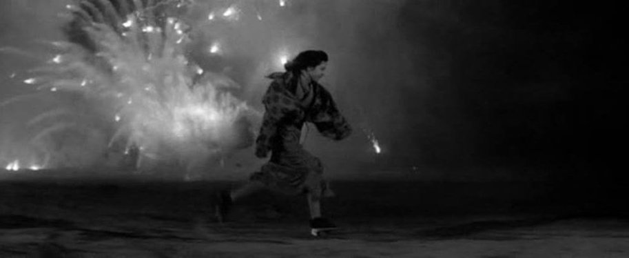 Where most of the first part of Story of a Prostitute is grounded resolutely in the tension between intimate frenzy and collective oppression, the last phase gains overtures of spiritual intensity, signalled as Harumi and Mikami are found in a formalistic, sensual pose, bathed in hallucinatory light, momentarily escaping their liminal selves in a moment of genuine amatory transcendence. This intimation is expanded later in the film’s major sequence, as the imprisoned Mikami is let out to man a machine gun well beyond the city gates during a partisan attack. Whilst the town flounders in panic and the rest of the garrison race to battle and then to flee to save their necks, Harumi searches for her lover amidst scurrying refugees and fear-bitten soldiers. She finally learns that a wounded Mikami has been left at the post because it was considered more important to bring back the machine gun. Harumi makes a charge across the plain as bombs explode around her and tracer bullets scourge the air. When she finds Mikami, damaged and unconscious, she lays him on the floor of the trench and settles down to die alongside him, watching the firefight now rendered mute, turned into a dazzling fireworks display burning with all the fevered, pyrotechnic force of Harumi’s psyche, at the edge of mortality. Harumi seems to remember, or imagine, an idyll of a seaside village, perhaps her hometown.