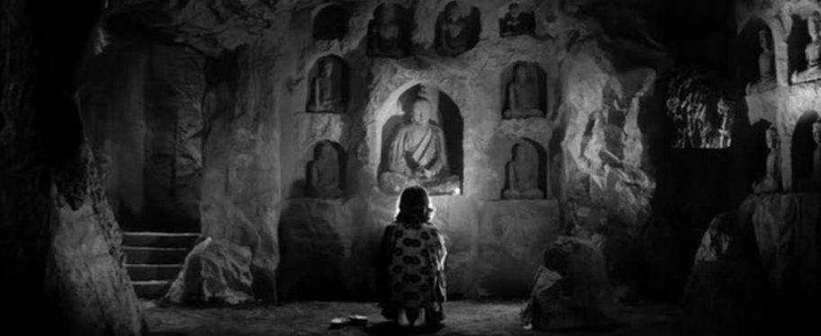But the couple is left tragically alive, taken prisoner by the partisans, who, in a coup of ironic disparity, are revealed as humanitarian and conscientious. Protesting that he and his fellows do not hate Japanese soldiers, a surgeon treats Mikami’s wounds in a cave temple filled with icons of the Buddha, lending the ensuing struggle not a tone of ethnic or political conflict but one between the dual poles of human identity, the communal and the personal-spiritual, with the latter, exemplified by Uno, defined as necessarily lonely. Mikami, for his part, sticks to his creed with increasingly fanatical determination, even as Harumi begs him to go with her and the partisans. Harumi evolves from whore to Madonna, singing songs with mystic power enough to delight the partisans, and praying in the midst of the carved Buddhas, suffused with angelic light. The partisans abandon them, and they’re brought home by their own side. However, far from being rewarded for his sterling patriotism, Mikami is now even more embarrassing to Narita and the Japanese command. The finale devolves into a tragicomedy in which the question becomes whether Mikami will die by the hand of the army he serves or his own. When Narita has a sergeant take him out to execute him and pass it off as a combat casualty, the sergeant can’t deliver a death blow with Mikami staring at him. His fellow soldiers refuse to shoot him and another partisan attack sends them all scurrying back to town again. Harumi finishes up tackling one of Mikami’s captors in an attempt to free him, and the confusion of the attack and a whirlwind evocation of one of Kurosawa’s rainstorms in invoking the pummelling force of the inevitable turned on humans, gives them a perfect chance for an escape.