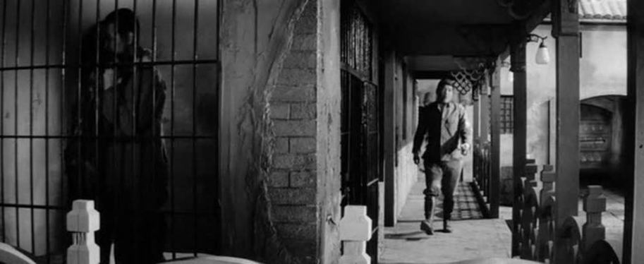 Harumi’s fantasies occasionally flood out of her mind and onto the screen, like the ripping image of Narita, and a later moment when she imagines driving Mikami to a rebellious frenzy by running across the brothel courtyard, stripping naked and hurling herself onto Narita, causing Mikami to chase her with sword out, ready to kill his commander, only to arrive and snap into a solicitous salute. Suzuki constantly proffers shots through windows, cracks, dividing frames and bars in visualising the schisms in his characters’ psyches and assailed situations. On the macrocosmic level, Suzuki’s direction is a study in a time and place and distinct camps of entwined and also polarised forces—soldiers, partisans, men, women, mind, body. Suzuki expostulates this in cool master shots that absorb milieu and detail, and tracking shots as spectacular and revelatory as anything in Kubrick or Welles, his camera powering through landscapes of panicking humanity and war. In another quietly astounding throwaway moment, Suzuki’s camera roves up and down the length of a banquet table at which solider carouse with whores and geishas, one the girls attempting to seduce the dismissive Narita, the atmosphere raw with the frenetic boisterousness that covers deep unease; finally the camera seeks out Mikami as he sneaks about in the shadows, looking for Harumi.